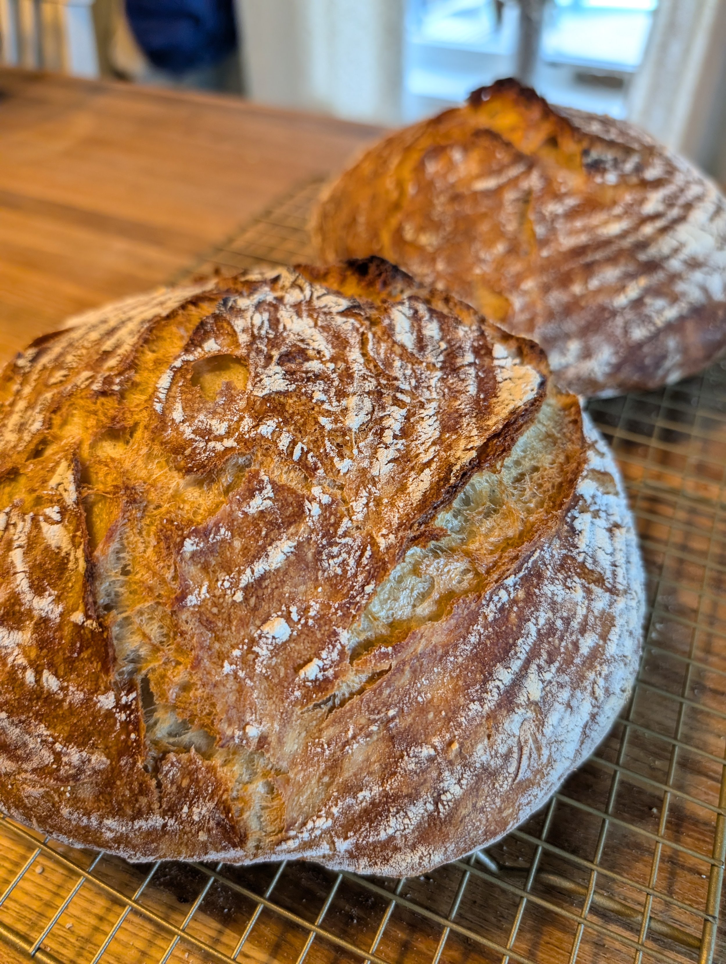 This round loaf is made with just flour, water, salt, and yeast…simple ingredients that make really good bread. We let the dough ferment slowly, which gives it great flavor and a soft, chewy inside.